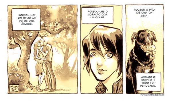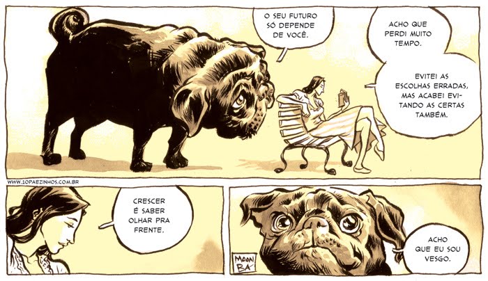 Com frequência passo pelo Blog do Fábio Moon e do Gabriel Bá para checar se tem uma nova tira da série “Quase Nada”. São pequenas situações, diálogos e frases que chamam à reflexão, sempre muito bem ilustradas. Às vezes, me causam só estranheza mas nunca indiferença. Não sei bem como descrevê-las, mas os exemplos abaixo dizem tudo. Até o momento deste post já são 331 tiras. Eu não perco uma. Mãos à obra!